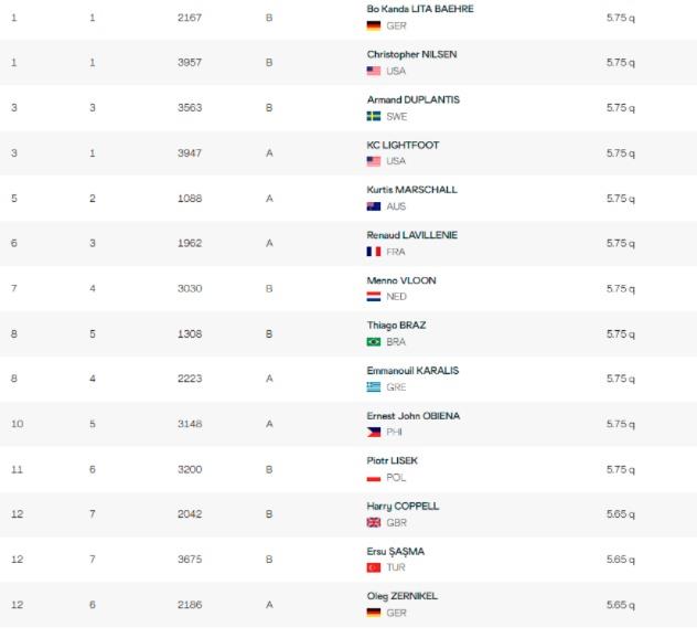 Εκτός τελικού έμεινε και ο Πολωνός Βογιεχόφσκι, που ήταν η έκπληξη του προκριματικού. Λίγο έλειψε να γίνει και μεγαλύτερη έκπληξη καθώς ο Ρενό Λαβιλενί χρειάστηκε τρεις προσπάθειες για να περάσει τα 5,50μ. και να μείνει στον αγώνα και στη συνέχεια πέρασε με την πρώτη τα 5,75μ. για να εξασφαλίσει θέση στον τελικό, όπου θα διεκδικήσει ένα μετάλλιο στο αγώνισμα όπου ο Αρμάντ Ντουπλάντις θα κατέβει ως το απόλυτο φαβορί για το χρυσό.