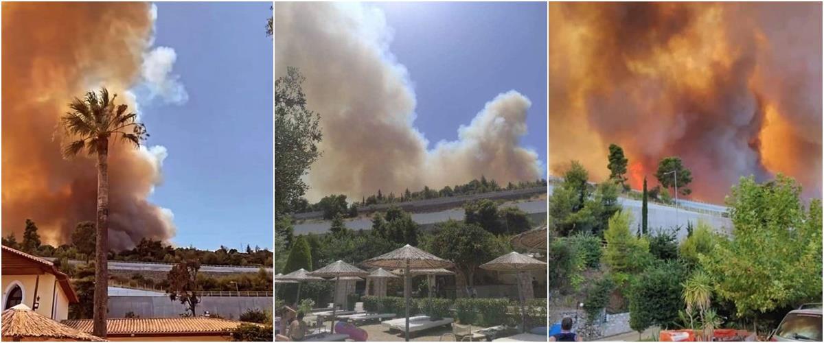 Εντωμεταξύ, χθες, πυροσβεστικά πλοιάρια βοηθούσαν στην κατάσβεση καθώς η φωτιά είχε επεκταθεί και κάτω από την παλαιά εθνική οδό, σε περιοχές κατάφυτες, γεμάτες πεύκα μέχρι το νερό.