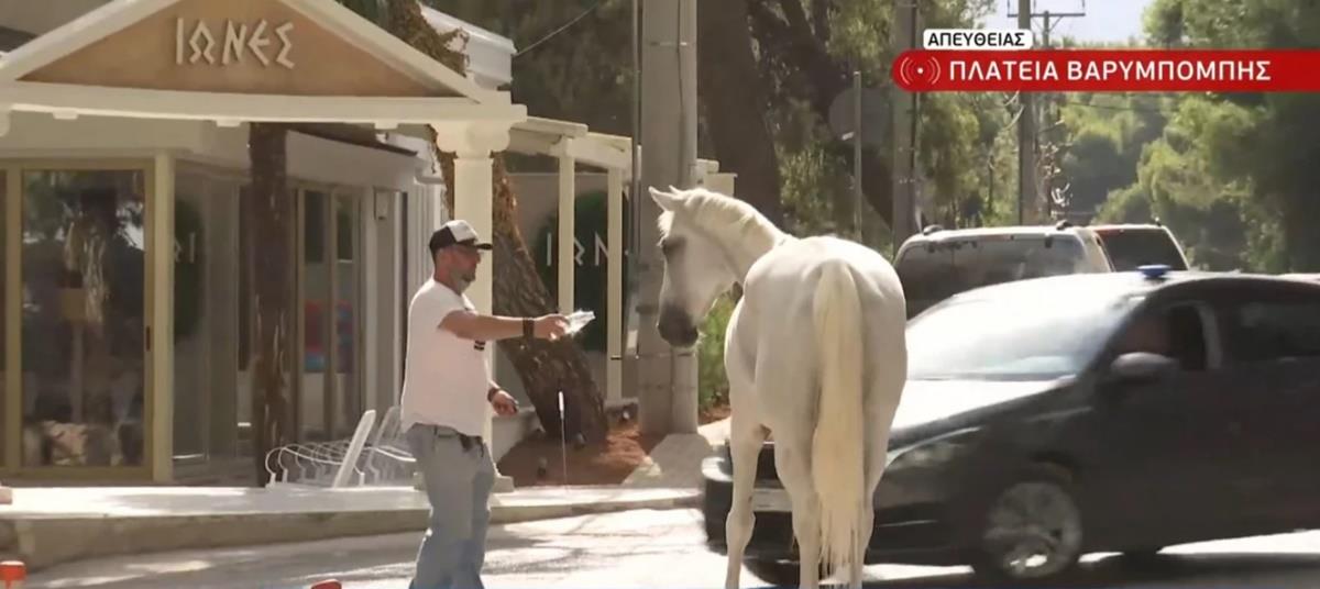 Συγκεκριμένα, η κάμερα της ΕΡΤ κατέγραψε τα άλογα από τους ιππικούς ομίλους που τρέχουν να σωθούν από την φωτιά. Τα ζώα αυτά έχουν κατέβει προς στην πλατεία.