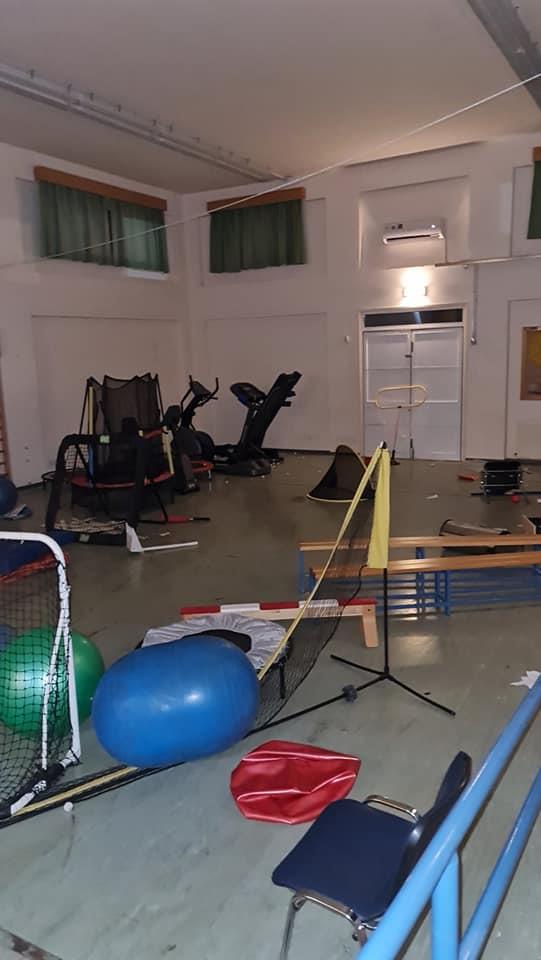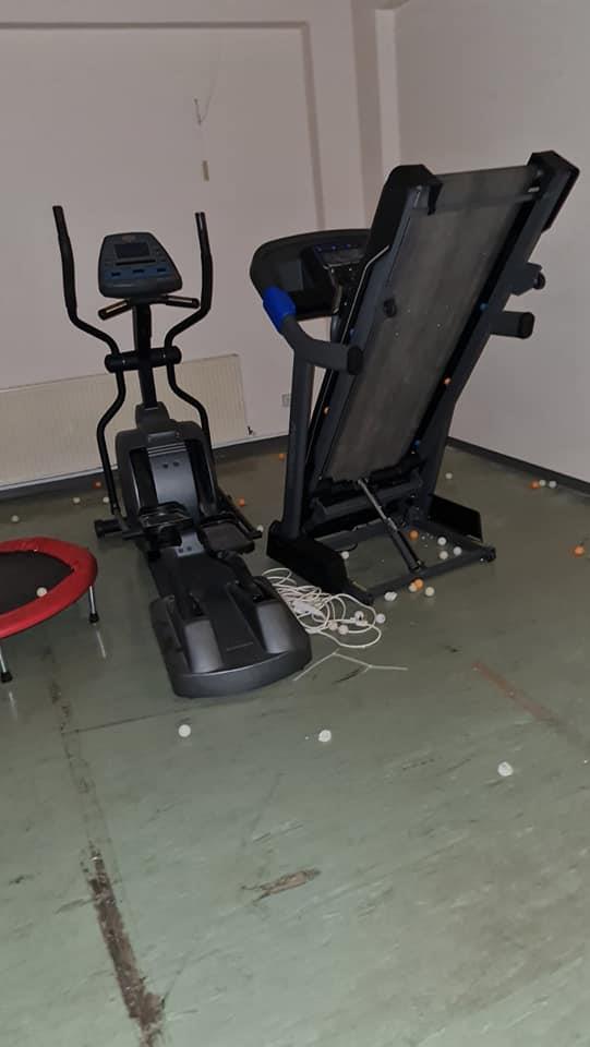 Εξάλλου, ζημιές προκάλεσαν και στον χώρο με τα όργανα γυμναστικής, όπου ξέσκισαν τις κουρτίνες στα παράθυρα και πέταξαν στο πάτωμα διάφορα αντικείμενα, καθώς και τους κάδους σκουπιδιών.