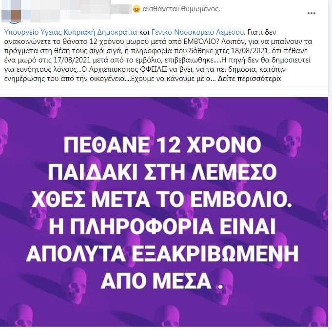 Ένα τραγικό fake news κάνει από το πρωί το γύρο του διαδικτύου προκαλώντας αναστάτωση, καθώς ανεγκέφαλοι - το λιγότερο που μπορείς να πεις για αυτούς - διέδωσαν πως πέθανε δωδεκάχρονο παιδί μετά από εμβολιασμό.
