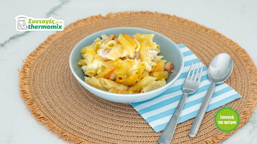 Μεταφέρετε τις πέννες στο πυρέξ μαζί με τα υπόλοιπα υλικά, προσθέστε το υγρό που κρατήσατε από τα μακαρόνια, προσθέστε το τυρί κρέμα και όλα τα υπόλοιπα αλεσμένα τυριά. Ανακατέψτε καλά. Σκεπάστε το πυρέξ με χαρτί ψησίματος και ασημόχαρτο και ψήστε σε προθερμασμένο φούρνο στους 180 βαθμούς για περίπου 40 λεπά. Σερβίρετε αμέσως.