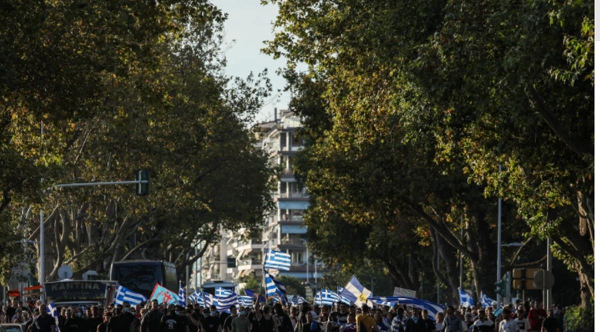 Οι διαμαρτυρόμενοι που πραγματοποίησαν νωρίτερα συγκέντρωση στην πλατεία Λευκού Πύργου, κινούνται με πανό και ελληνικές σημαίες στα χέρια και φωνάζουν συνθήματα κατά της κυβέρνησης.
