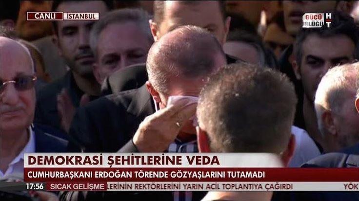 Ο πρόεδρος της Τουρκίας Ρετζέπ Ταγίπ Ερντογάν δεν κατάφερε να συγκρατήσει τα δάκρυά του σήμερα στην κηδεία ενός άνδρα, που σκοτώθηκε μαζί με τον γιο του κατά την εκδήλωση της απόπειρας πραξικοπήματος, σύμφωνα με τις εικόνες που μετέδωσαν σε απευθείας σύνδεση τουρκικά τηλεοπτικά δίκτυα.