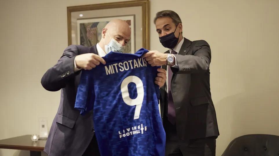 Ο κ. Ινφαντίνο δώρισε στον κ. Μητσοτακη μια φανέλα της παγκόσμιας Ομοσπονδίας ποδοσφαίρου με τον αριθμό 9 καθώς και ένα σετ με τις χαρακτηριστικές κάρτες των διαιτητών, την κίτρινη και την κόκκινη.
