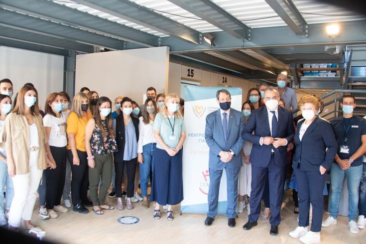 Συγχαρητήρια και ευχαριστίες απηύθυνε σήμερα ο Πρόεδρος της Δημοκρατίας, Νίκος Αναστασιάδης προς τους νοσηλευτές και μέλη του προσωπικού, που στελεχώνουν το εμβολιαστικό κέντρο στην Κρατική Έκθεση, όπου το πρωί έλαβε την τρίτη δόση του εμβολίου κατά του κορωνοϊού.