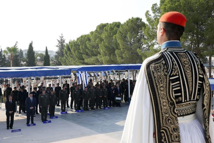 Στη συνέχεια έγινε κατάθεση στεφάνων μεταξύ άλλων από τον Πρόεδρο της Δημοκρατίας Νίκο Αναστασιάδη, τον Αρχιεπίσκοπο Κύπρου Χρυσόστομο Β`, τον Αρχιεπίσκοπο Μεγάλης Βρετανίας και Θυατείρων Γρηγόριο, τον Πρόεδρο της Βουλής Δημήτρη Συλλούρη, εκ μέρους της Ελληνικής Κυβέρνησης από τον Πρέσβη της Ελλάδος Ηλία Φωτόπουλο, εκ μέρους της Βουλής των Ελλήνων από τον Β΄ Αντιπρόεδρος Γιώργο Βαρεμένο, από αρχηγούς ή εκπροσώπους κομμάτων, τον Αρχηγό της Εθνικής Φρουράς Γεώργιο Μπασιακούλη, τον Αρχηγό της Αστυνομίας Ζαχαρία Χρυσοστόμου, κ.ά.