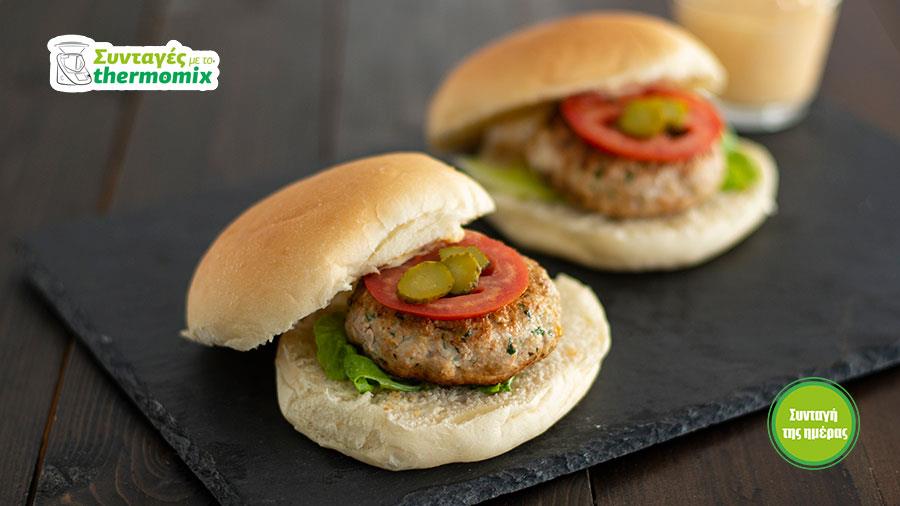 Σερβίρετε σε ψωμάκια για burger με τη σάλτσα μαγιονέζας, ροδέλες αγγουράκι τουρσί, ροδέλες ντομάτας και μαρούλι.