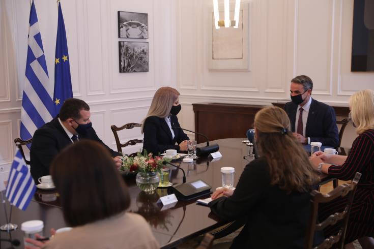 «Είχαμε μια ουσιαστική συζήτηση και ευχαριστώ θερμά τον κ. Πρωθυπουργό για τη θερμή υποδοχή και την άμεση ανταπόκρισή του για να συζητήσουμε ουσιαστικά όλα τα ζητήματα που απασχολούν τις δύο χώρες τόσο σε επίπεδο τοπικό, όσο και σε ευρωπαϊκό επίπεδο», σημείωσε η κ. Δημητρίου, σε δηλώσεις της μετά τη συνάντηση.