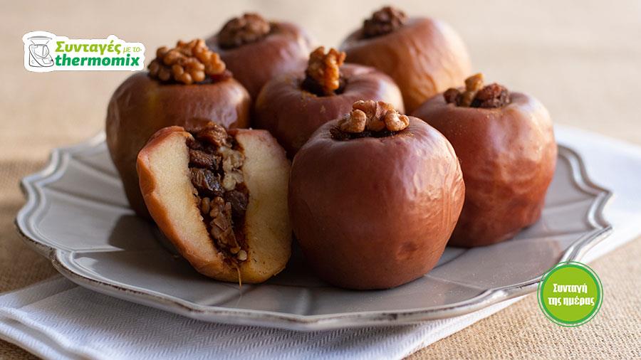 Βάλτε στον κάδο 500 γρ. νερό, κλείστε το καπάκι, τοποθετήστε στο καπάκι του κάδου το μπολ με τα 80 γρ. μουσκεμένα σταφιδάκια σε 50 γρ. κονιάκ, προσθέστε μέσα 1 κουταλιά κανέλα, 1 /4 κουταλάκι γαρύφαλα, 50 γρ. ζάχαρη, 50 γρ. καρύδια και ανακατέψτε. Γεμίστε με το μείγμα τον κενό πυρήνα των μήλων στους δίσκους Varoma, τοποθετήστε το Varoma στη θέση του και μαγειρέψτε στον ατμό 35 λεπτά/Varoma/ταχύτητα 1.