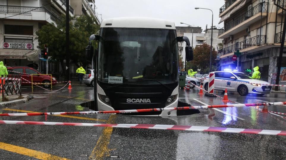 BINTEO: Υποχώρησε οδόστρωμα και «κατάπιε» λεωφορείο στη Θεσσαλονίκη