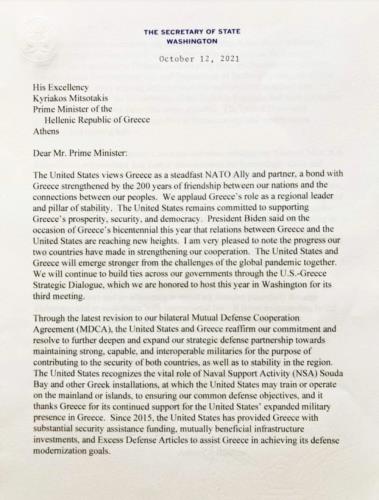 Αναφερόμενος στην ανανέωση της Συμφωνίας Αμοιβαίας Αμυντικής Συνεργασίας (MDCA), σε άλλο σημείο της επιστολής, ο κ. Μπλίνκεν υπογραμμίζει τα εξής: «Επεκτείνει τη στρατηγική αμυντική εταιρική σχέση και εμφανώς δείχνει τη σταθερή μας αποφασιστικότητα να διαφυλάξουμε και να προστατεύσουμε αμοιβαία την κυριαρχία και την εδαφική ακεραιότητα των χωρών μας έναντι ενεργειών που απειλούν την ειρήνη, συμπεριλαμβανομένης της ένοπλης επίθεσης ή της απειλής αυτής».