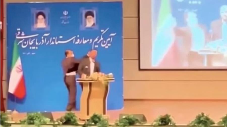 Ένα απίστευτο σκηνικό εκτυλίχθηκε στο Ιράν και μάλιστα επί σκηνής, την ώρα που το «θύμα» ήταν στο βήμα και μιλούσε στο κοινό. Ένας Ιρανός πολιτικός λοιπόν, ανέβηκε στη σκηνή και πλησίασε τον νέο Κυβερνήτη Abedin Khorram που μιλούσε εκείνη την ώρα και απευθείας, χωρίς καμία κουβέντα, τον χαστούκισε στο πρόσωπο ενώ στη συνέχεια τον έσπρωξε. Ο πολιτικός φέρεται πως ήταν έξαλλος, γιατί η γυναίκα του έκανε το εμβόλιο Covid-19 από έναν άνδρα γιατρό.