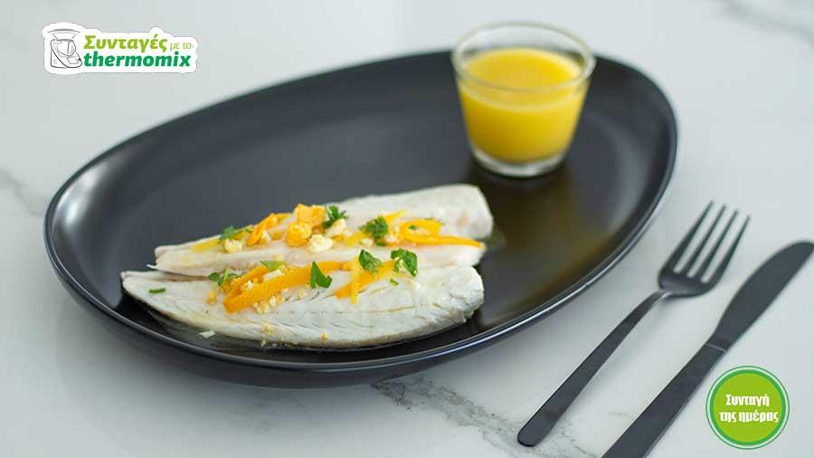 Προσθέστε τη φλούδα από 1 /2 λεμόνι και 1 /2 πορτοκάλι σε λεπτές λωρίδες ζουλιέν, 30 γρ. χυμό λεμονιού, 70 γρ. χυμό πορτοκαλιού, 200 γρ. νερό, 1 κουταλάκι αλάτι. Τοποθετήστε το Varoma στη θέση του, βάλτε 2 φιλέτα λαβράκι στο βαθύ δίσκο και 4 στον ξέβαθο δίσκο Varoma, ραντίστε τα με το υπόλοιπο 1 /2 κουταλάκι αλάτι. Μαγειρέψτε στον ατμό 15 λεπτά/Varoma/ταχύτητα 1.
