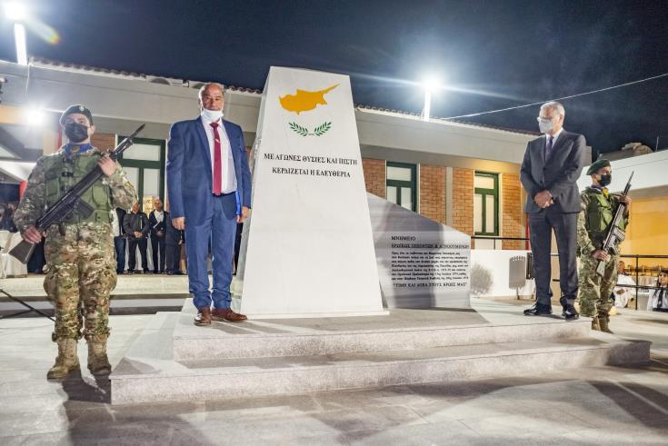 Καταλήγοντας στο χαιρετισμό του, ο Υπουργός Εσωτερικών συνεχάρη όλους όσοι πήραν την πρωτοβουλία να τροχοδρομήσουν την υλοποίηση του μνημείου των ηρωικώς πεσόντων και αγνοουμένων, «το οποίο θα λειτουργεί ως άφωνο σάλπισμα εγρήγορσης και αγώνα για την ανατροπή των κατοχικών δεδομένων και την επανένωση της πατρίδας μας».