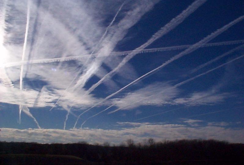 Οι άσπρες λωρίδες που συχνά πυκνά βλέπουμε στο πέρασμα των αεροπλάνων προέρχονται από τη συμπύκνωση αερίων εξάτμισης κινητήρων των αεροσκαφών.