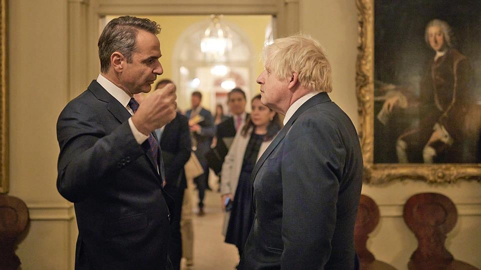 Ο Έλληνας πρωθυπουργός Κυριάκος Μητσοτάκης με τον Βρετανό ομόλογό του Μπόρις Τζόνσον κατά την σημερινή τους συνάντηση