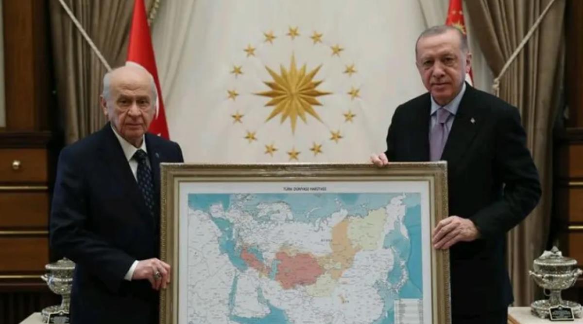 Πριν από το ιδιαίτερο τετ α τετ, Ερντογάν και Μπαχτσελί πόζαραν μπροστά στον φακό, κρατώντας προκλητικά τον χάρτη των «τουρκικών χωρών», μέσα στον οποίον συμπεριλαμβάνονται τουρκόφωνες χώρες της κεντρικής Ασίας αλλά και περιοχές που ζουν μουσουλμάνοι που η Τουρκία θεωρεί «ομογενείς», όπως στην Ρωσία, στα νότια Βαλκάνια κ.α.