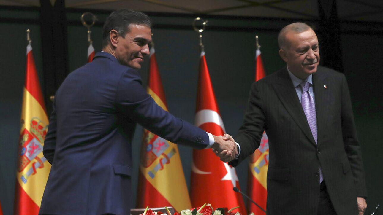Μετά την υπογραφή έξι συμφωνιών μεταξύ Ισπανίας και Τουρκίας, που περιλαμβάνουν συνεργασία στους τομείς των ανανεώσιμων πηγών ενέργειας, της αντιμετώπισης καταστροφών και του αθλητισμού και την εκδήλωση από τον Ρετζέπ Ταγίπ Ερντογάν ενδιαφέροντος για εμβάθυνση της αμυντικής συνεργασίας με την αγορά δεύτερου αεροπλανοφόρου και πιθανώς και υποβρυχίων από την Ισπανία, ο Πέδρο Σάντσεθ τόνισε στην κοινή συνέντευξη Τύπου ότι οι διμερείς σχέσεις Μαδρίτης- Άγκυρας έχουν φτάσει σε εξαιρετικό επίπεδο, για να προσθέσει: «Θέλουμε η Τουρκία να είναι μέρος της Ευρωπαϊκής Ένωσης (ΕΕ). Η Τουρκία δεν είναι απλώς γείτονας, είναι κοινός σύμμαχος της ΕΕ».