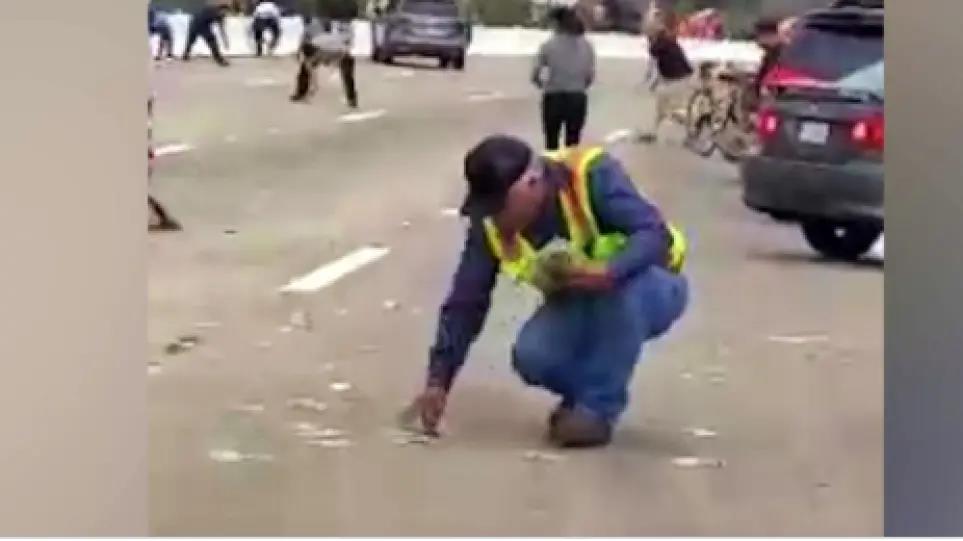 Βίντεο που αναρτήθηκαν σε μέσα κοινωνικής δικτύωσης δείχνουν οδηγούς να σταματούν τα οχήματά τους στην μέση του δρόμου και στη λωρίδα έκτακτης ανάγκης και να κατεβαίνουν τρέχοντας να μαζέψουν με τις χούφτες δολάρια. Κάποιοι τα πετάγαν στον αέρα σαν κομφετί.