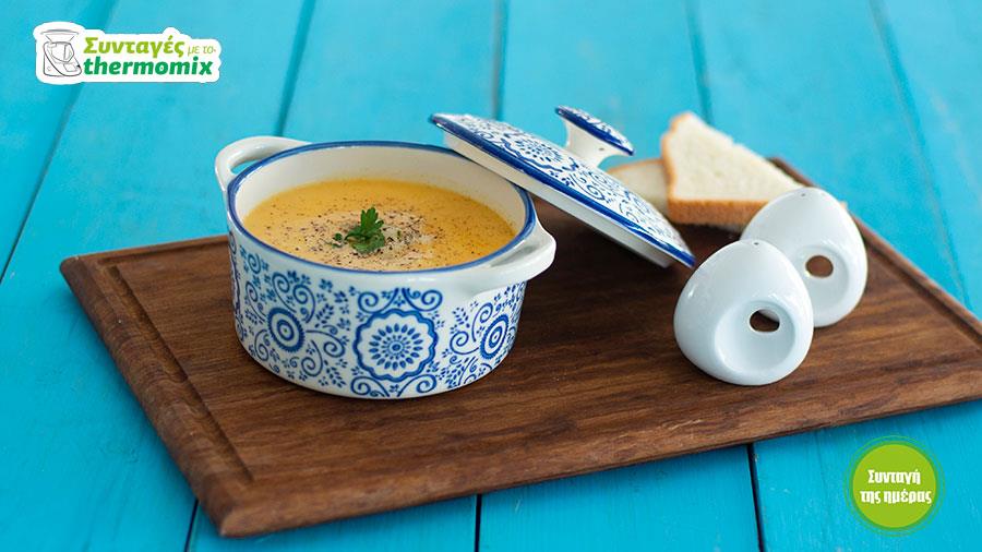 Μεταφέρετε τη σουπιέρα κοντά στο Thermomix, αφαιρέστε τη μεζούρα από τον κάδο και ρυθμίστε 1 λεπτό και 30 δευτερόλεπτα/ ταχύτητα 2.5 προσθέτοντας με μια κουτάλα, λίγο-λίγο το ζωμό από τη σουπιέρα, από το άνοιγμα της μεζούρας πάνω στα περιστρεφόμενα μαχαίρια.