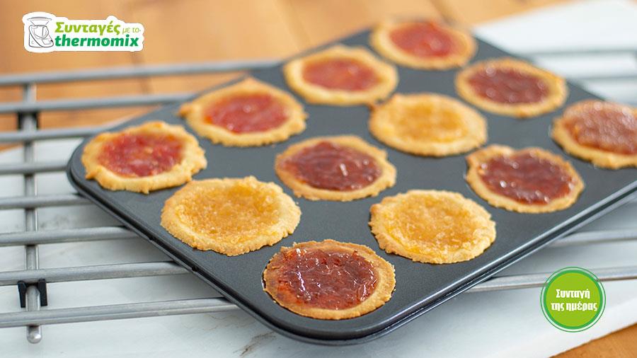 Αφαιρέστε τη φόρμα χωρίς να σβήσετε το φούρνο και γεμίστε τις βάσεις από ζύμη με 1 κουταλάκι μαρμελάδα της αρεσκείας σας. Απλώστε ομοιόμορφα, βάλτε πίσω στο φούρνο και ψήστε για ακόμα 8-10 λεπτά ή μέχρι να ροδίσει η ζύμη.