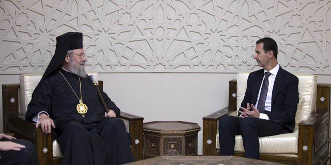 Συνάντηση με τον πρόεδρο της Συρίας, Μπασάρ Αλ Άσαντ, είχε σήμερα ο Αρχιεπίσκοπος Κύπρου Χρυσόστομος ο Β`, ο οποίος πραγματοποιεί επίσκεψη στη Δαμασκό.