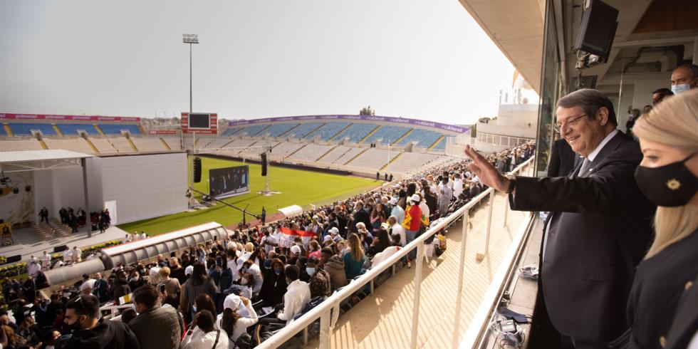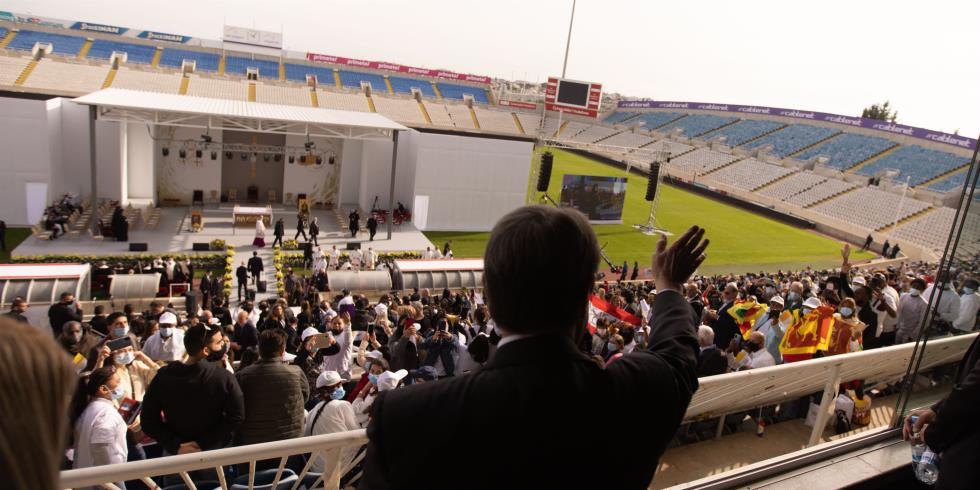 Ο προκαθήμενος της Ρωμαιοκαθολικής Εκκλησίας έφτασε στο ΓΣΠ στις 10 το πρωί και τον υποδέχθηκε ο Πρόεδρος Αναστασιάδης. Στο στάδιο στήθηκε μεγάλη εξέδρα και γύρω στις επτά χιλιάδες πιστοί από την Κύπρο και άλλες χώρες ήταν παρόντες.