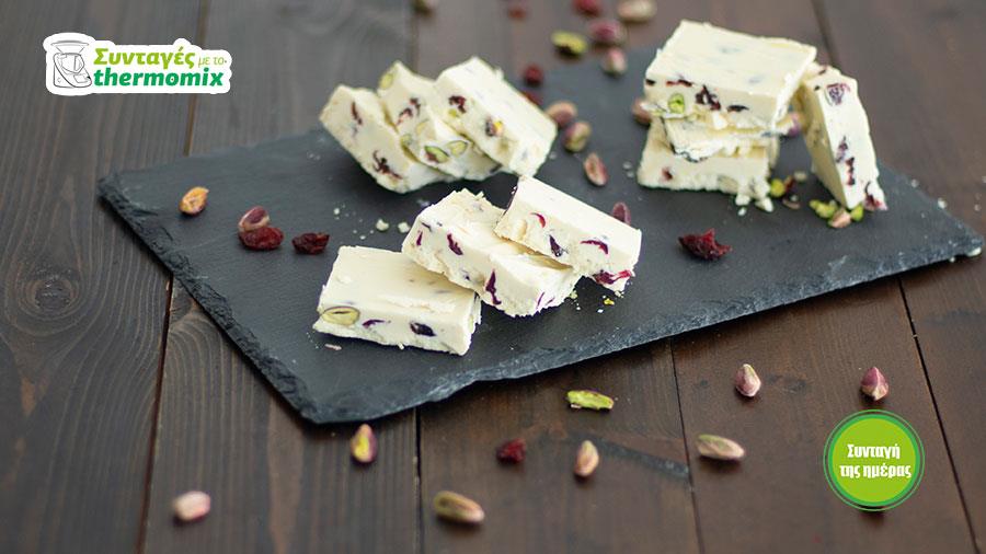 Για μαύρη σοκολάτα: Αντικαταστήστε τη λευκή σοκολάτα με μαύρη σοκολάτα (τουλάχιστον 50% κακάο), τα φιστίκια Αιγίνης με φουντούκια ή αμύγδαλα και τα κράνμπερι με αποξηραμμένα κεράσια. Θα μπορούσατε να προσθέσετε λίγο αλεσμένο αποξηραμμένο τσίλι. Εναλλακτικά, αντικαταστήστε τα κράνμπερι με αλεσμένη φλούδα πορτοκαλιού και φυσικό εκχύλισμα πορτοκαλιού με βάση λαδιού