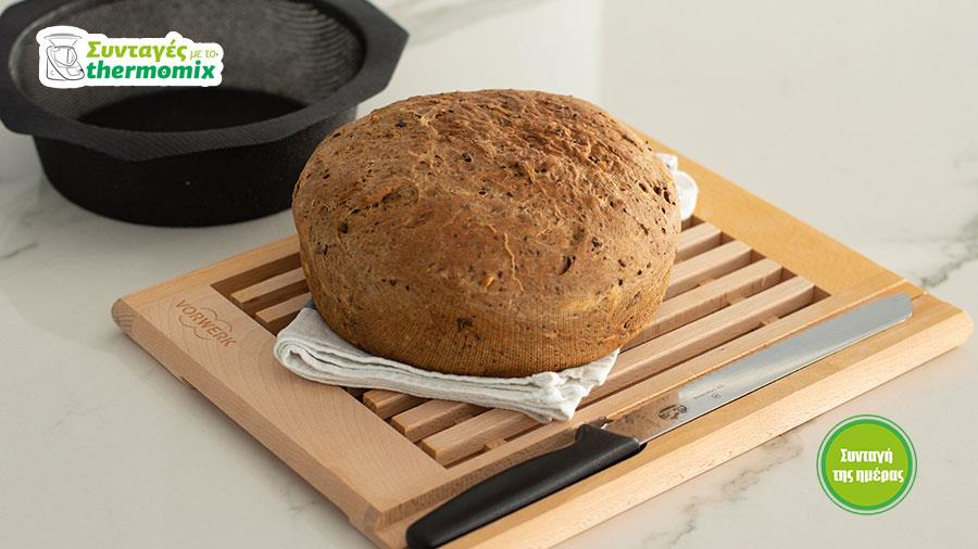 Ψήστε το ψωμί για 40 λεπτά (180°C). Αφήστε να κρυώσει στη φόρμα για 10 λεπτά. Ξεφορμάρετε σε σχάρα και αφήστε να κρυώσει καλά, πριν το κόψετε για να σερβίρετε.