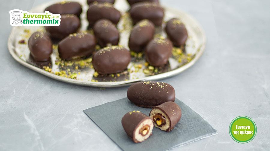 Καλύψτε περιμετρικά τα φοινίκια με πάστα αμυγδάλου και μεταφέρετε στο ψυγείο. Εν τω μεταξύ, συνεχίστε με την επικάλυψη σοκολάτας.