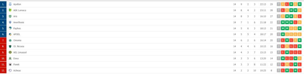 Μάλιστα, μετά τη νίκη του με 4-2 επί της Ομόνοιας, ο ΑΠΟΕΛ ανέβηκε στο έκτο σκαλοπάτι και έπιασε τους πράσινους στους 20 βαθμούς.