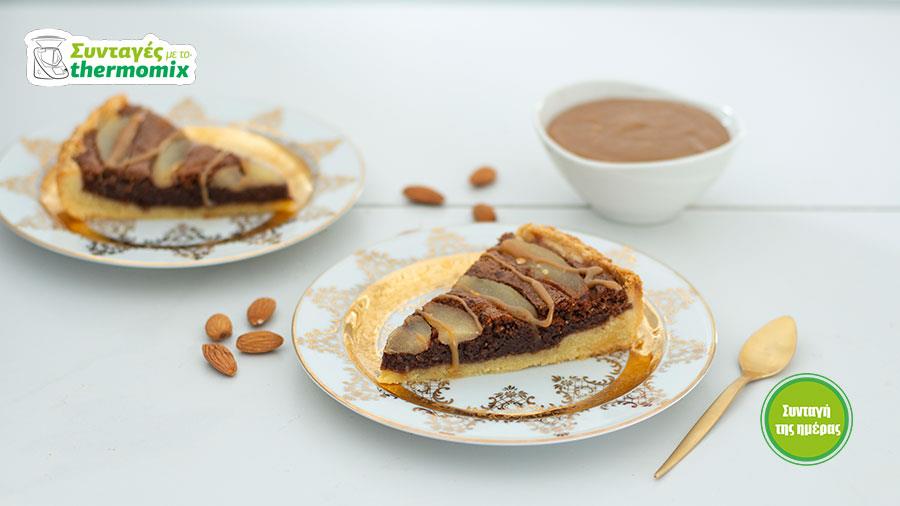 Καλύψτε τον πάτο της μισοψημένης ζύμης με τη γέμιση, γαρνίρετε με το αχλάδι κομπόστο και ψήστε 45 λεπτά στους 180°C. Εν τω μεταξύ συνεχίστε με τη σάλτσα καραμέλας.