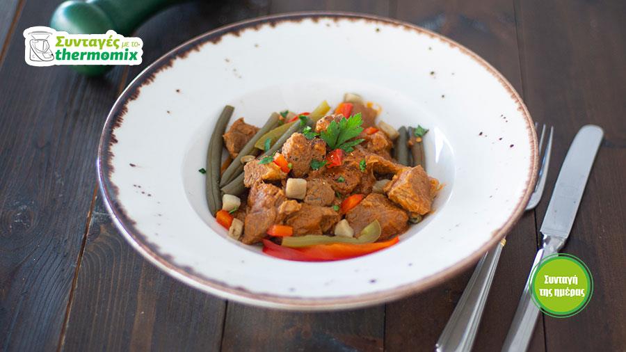 Προσθέστε 1 κουταλάκι κάρυ, 1 κουταλιά πάστα ζωμό λαχανικών, 400 γρ. νερό, 1 πρέζα αλάτι, 1 πρέζα πιπέρι, 1 πρέζα κύμινο, 50 γρ. πάστα ντομάτας, κλείστε τον κάδο, τοποθετήστε το Varoma στη θέση του, βάλτε μέσα 500 γρ. φασολάκι, 120 γρ. πράσινη πιπεριά, 120 γρ. κόκκινη πιπεριά, 250 γρ. μελιτζάνες, 400 γρ. ξεφλουδισμένες ντομάτες και μαγειρέψτε στον ατμό 55 λεπτά/Varoma/αντίστροφη κίνηση/ταχύτητα κουτάλι.