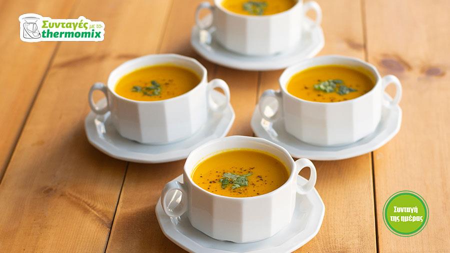 Μεταφέρετε σε σουπιέρα, γαρνίρετε με 3-4 κλωνάρια ψιλοκομμένο κόλιανδρο και την υπόλοιπη 1 πρέζα πιπέρι. Σερβίρετε αμέσως.