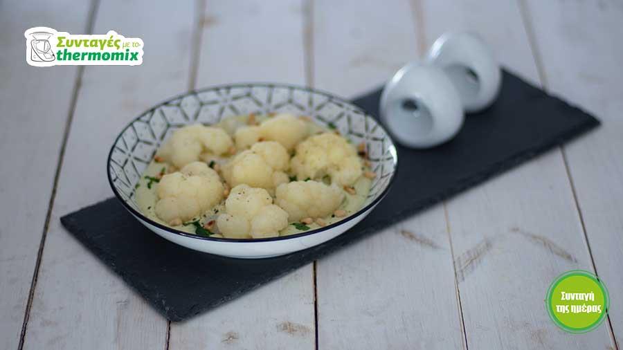 Μεταφέρετε το κουνουπίδι σε μια πιατέλα σερβιρίσματος, περιχύστε με τη σάλτσα και γαρνίρετε με 10 γρ. μαϊντανό και 50 γρ. καβουρδισμένα πινόλια. Σερβίρετε αμέσως.
