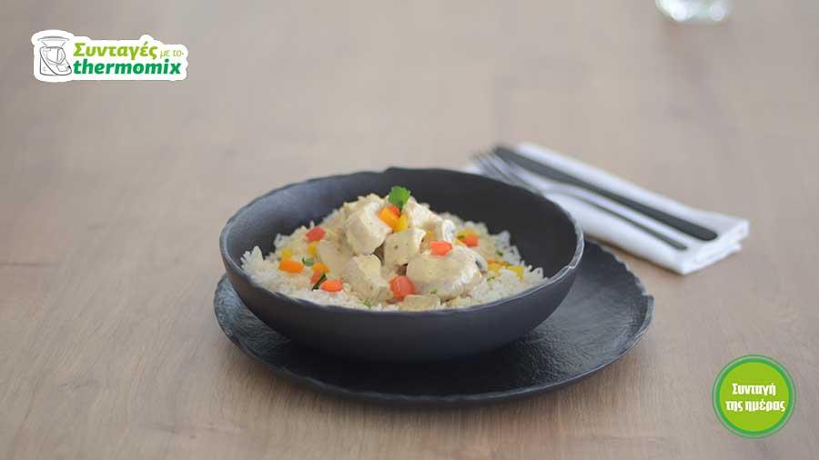 Αντί να τσιγαρίσετε το κοτόπουλο, μπορείτε να το μαγειρέψετε στον ατμό μαζί με τα λαχανικά και το ρύζι (κοτόπουλο στο βαθύ δίσκο και πιπεριές-μανιτάρια στο ξέβαθο) και ακολούθως να φτιάξετε τη σάλτσα ξεκινώντας από το Βήμα 2
