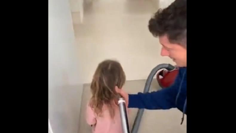 Ο Πολωνός αποδεικνύεται πολύ ευρηματικός, χρησιμοποιώντας την... ηλεκτρική σκούπα για να πιάσει τα μαλλιά της κορούλας του αλογοουρά!