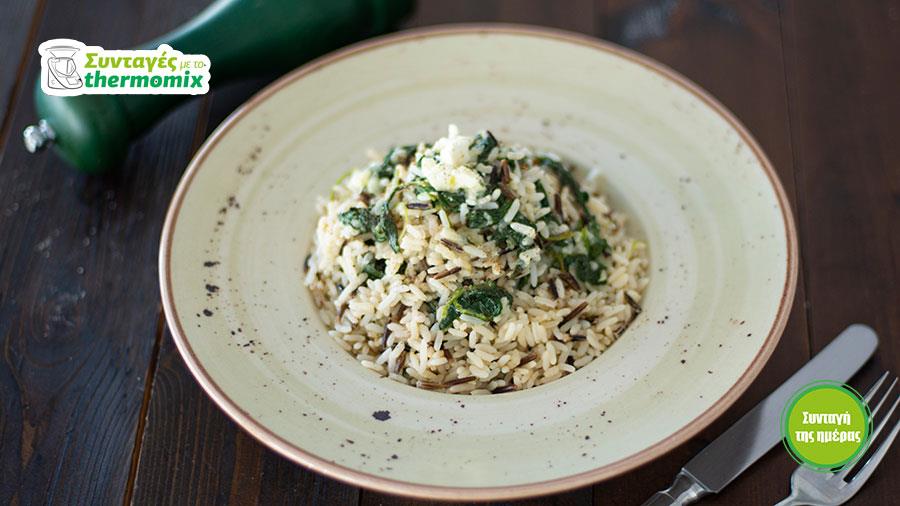 Με τη βοήθεια της σπάτουλας, μεταφέρετε το ρύζι στην πιατέλα με το σπανάκι, ανακατέψτε ελαφρά και σερβίρετε ζεστό.