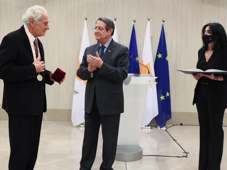 Το Μετάλλιο Εξαίρετης Προσφοράς της Κυπριακής Δημοκρατίας απονεμήθηκε από τον Πρόεδρο της Δημοκρατίας Νίκο Αναστασιάδη στον Τάκη Χατζηδημητρίου, τέως πρόεδρο της Δικοινοτικής Επιτροπής για τον Πολιτισμό, σε τελετή που πραγματοποιήθηκε σήμερα στο Προεδρικό Μέγαρο.