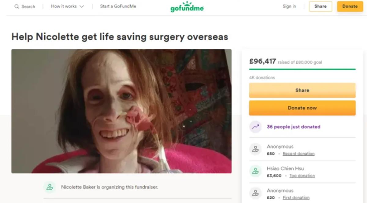Έτσι λοιπόν δημιούργησε ένα προφίλ στην ιστοσελίδα «gofundme.com» μέσω του οποίου από την αρχή του 2022 έως και σήμερα συγκεντρώθηκαν 95.000 λίρες από δωρεές που έκαναν πάνω από 4.000 άνθρωποι. Πάντως παρά την άμεση κινητοποίηση χιλιάδων ανθρώπων η 36χρονη δηλώνει πως είναι πολύ άρρωστη και πολύ αδύναμη για να δώσει τον μεγαλύτερο αγώνα της ζωής της.