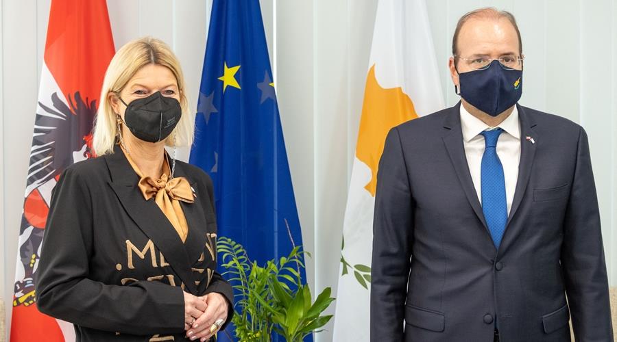 Στη συνέχεια, σημείωσε πως η Κύπρος είναι εκτεθειμένη σε τεράστιες πιέσεις στην περιοχή της Μεσογείου και η προσπάθεια της Αυστρίας αντιμετωπίζει αυτή την κατάσταση με μεγάλη ανησυχία. Δήλωσε ότι ως μέλος της ΕΕ, η χώρα της υποστηρίζει πλήρως τη θέση της Κύπρου. «Η εδαφική κυριαρχία ενός κράτους δεν πρέπει να παραβιάζεται σε καμία περίπτωση και οποιαδήποτε ενέργεια από αυτή την άποψη αποτελεί παραβίαση των διεθνών νόμων», τόνισε.