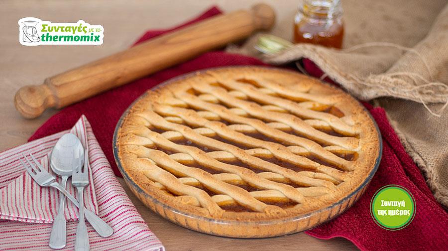 Μεταφέρετε 1 /3 της ζύμης σε μια φόρμα τάρτας. Πιέστε με τα χέρια τη ζύμη να καλύψει τη βάση και τα τοιχώματα της τάρτας. Απλώστε τη μαρμελάδα σε όλη την επιφάνεια της βάσης. Πλάστε την υπόλοιπη ζύμη σε κουλούρια. Τοποθετήστε τα κουλούρια ζύμης σταυρωτά, πάνω από τη γέμιση, αφήνοντας κενό 3-4 εκ. μεταξύ τους. Ψήστε για 40-50 λεπτά σε προθερμασμένο φούρνο στους 180°C.
