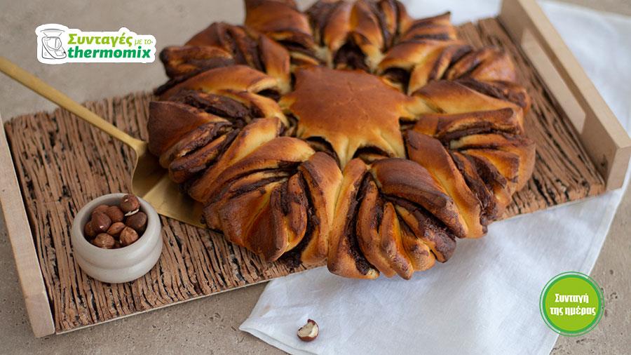 Ανοίξτε με τη βοήθεια του πλάστη το δεύτερο κομμάτι ζύμης, σε στρογγυλό σχήμα και καλύψτε με τα υπόλοιπα 200 γρ. μερέντα.