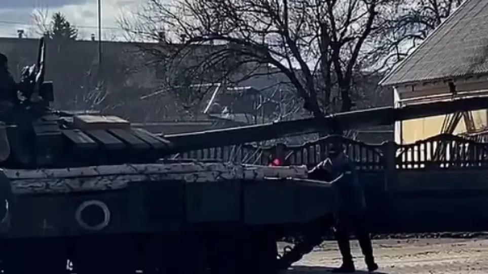 Ένας ακόμα Ουκρανός πολίτης καταγράφεται από βίντεο να προσπαθεί να εμποδίσει μόνος του και χωρίς καμιά άλλη βοήθεια την προέλαση της ρωσικής στρατιωτικής φάλαγγας με τις σκηνές να θυμίζουν το τανκ της πλατείας Τιεν Αν Μεν, όπου ένας φοιτητής μπλόκαρε τις κινεζικές στρατιωτικές δυνάμεις.