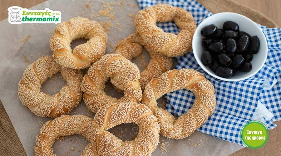 Μοιράστε τη ζύμη σε 12 κομμάτια των 80 γρ. περίπου το καθένα και πλάστε μπαστούνια μήκους 85 εκ. Διπλώστε το κάθε μπαστούνι στη μέση, στρίψτε το και ενώστε τις δυο άκριες για να γίνει στεφάνι.