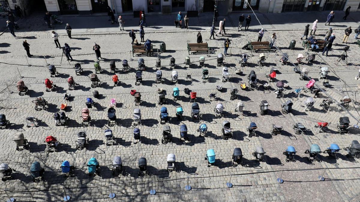 Εκατόν εννέα άδεια παιδικά καρότσια, 109 χαμένες παιδικές ζωές. Εκατόν εννέα καρότσια τοποθετήθηκαν την Παρασκευή στην κεντρική πλατεία της πόλης Λβίβ στη μνήμη των 109 παιδιών της Ουκρανίας που σκοτώθηκαν από την αρχή της ρωσικής εισβολής.