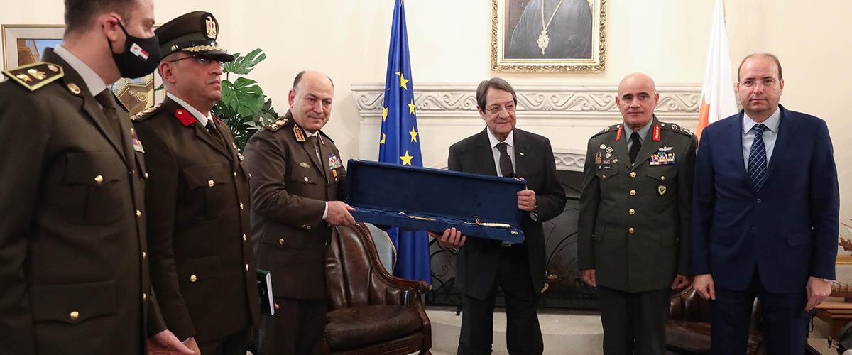 Στην αναγνώριση των κοινών προκλήσεων που αντιμετωπίζουν Κύπρος και Αίγυπτος και την πρόθεση για περαιτέρω εμβάθυνση της συνεργασίας και σε άλλους τομείς αμοιβαίου ενδιαφέροντος, επικεντρώθηκε η συνάντηση του Αρχηγού των Ενόπλων Δυνάμεων της Αραβικής Δημοκρατίας της Αιγύπτου, Αντιστράτηγου Οσάμα Ασκάρ, με τον Πρόεδρο της Δημοκρατίας Νίκο Αναστασιάδη την Τρίτη στο Προεδρικό Μέγαρο, στην παρουσία του Υπουργού Άμυνας Χαράλαμπου Πετρίδη και του Αρχηγού της Εθνικής Φρουράς Αντιστράτηγου Δημόκριτου Ζερβάκη.