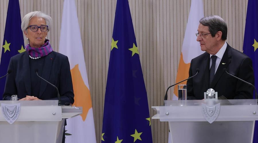 Η Κύπρος βρίσκεται στον πυρήνα της Ευρώπης και αποτελεί σημαντικό παίκτη της ΕΕ και της Ευρωζώνης, τόνισε η Πρόεδρος της Ευρωπαϊκής Κεντρικής Τράπεζας Κριστίν Λαγκάρντ ενώπιον του Προέδρου της Δημοκρατίας Νίκου Αναστασιάδη και του Διοικητή της Κεντρικής Τράπεζας Κωνσταντίνου Ηροδότου.
