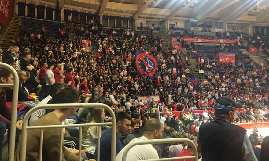 Στο ματς, λοιπόν, στη «Χάλα Πιονίρ» απέναντι στην ομάδα του Εργκίν Αταμάν, οι φίλοι του Ερυθρού Αστέρα είχαν στην κερκίδα μία σημαία κατά τόσο του ΝΑΤΟ, όσο και της Ευρωπαϊκής Ένωσης.